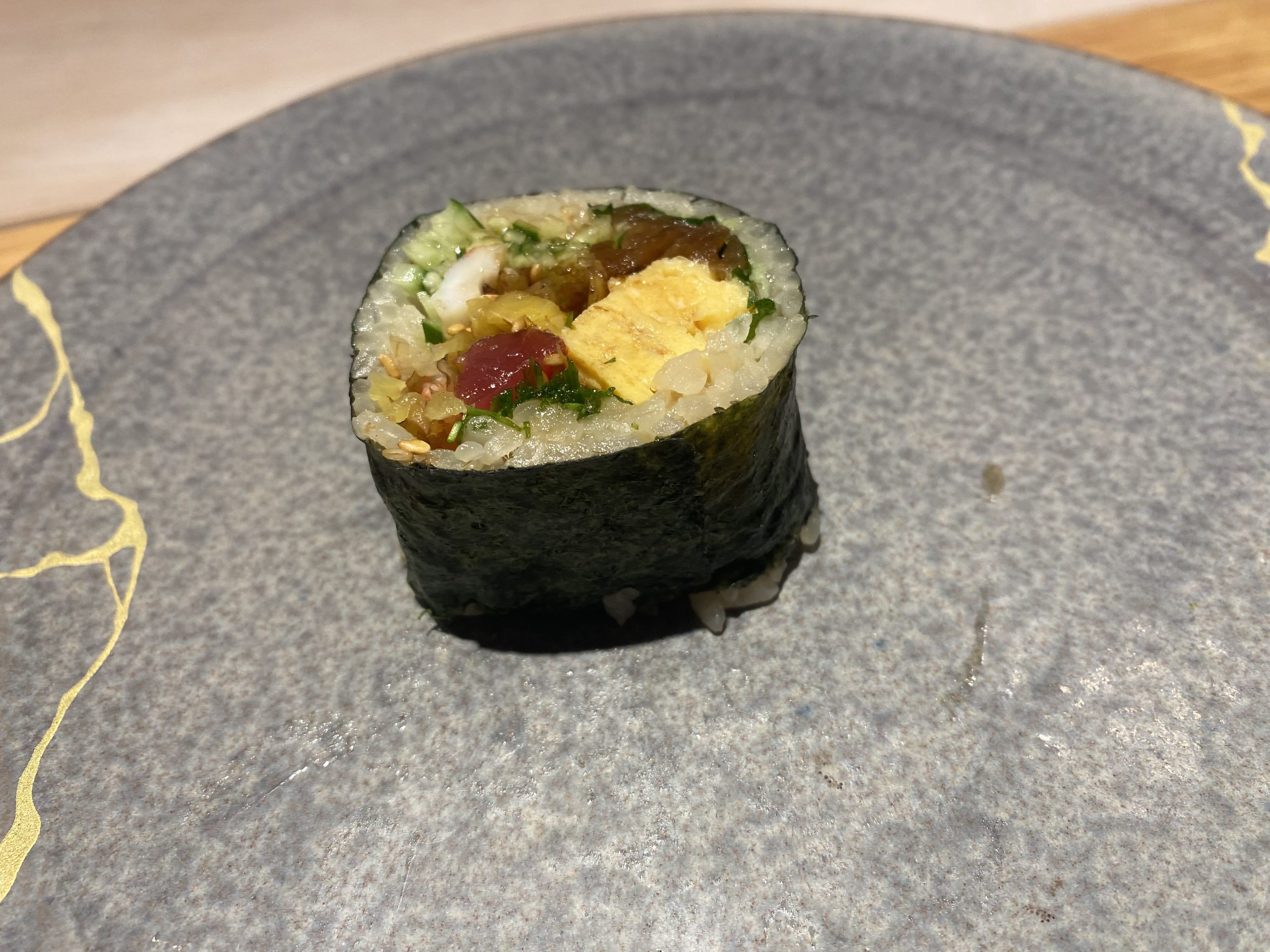最後は太巻きとなります。こちらも口に入れた時のバランスがとても良くもう少しいただきたい気持ちにさせます。もう少し食べたい。鮑のお造りは食べたくありませんが、もう一貫、二貫そしてかっぱ巻きを食べたい。