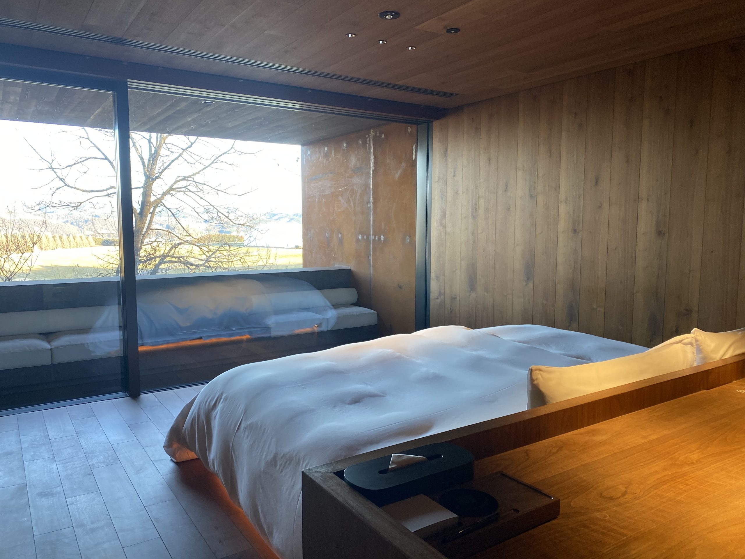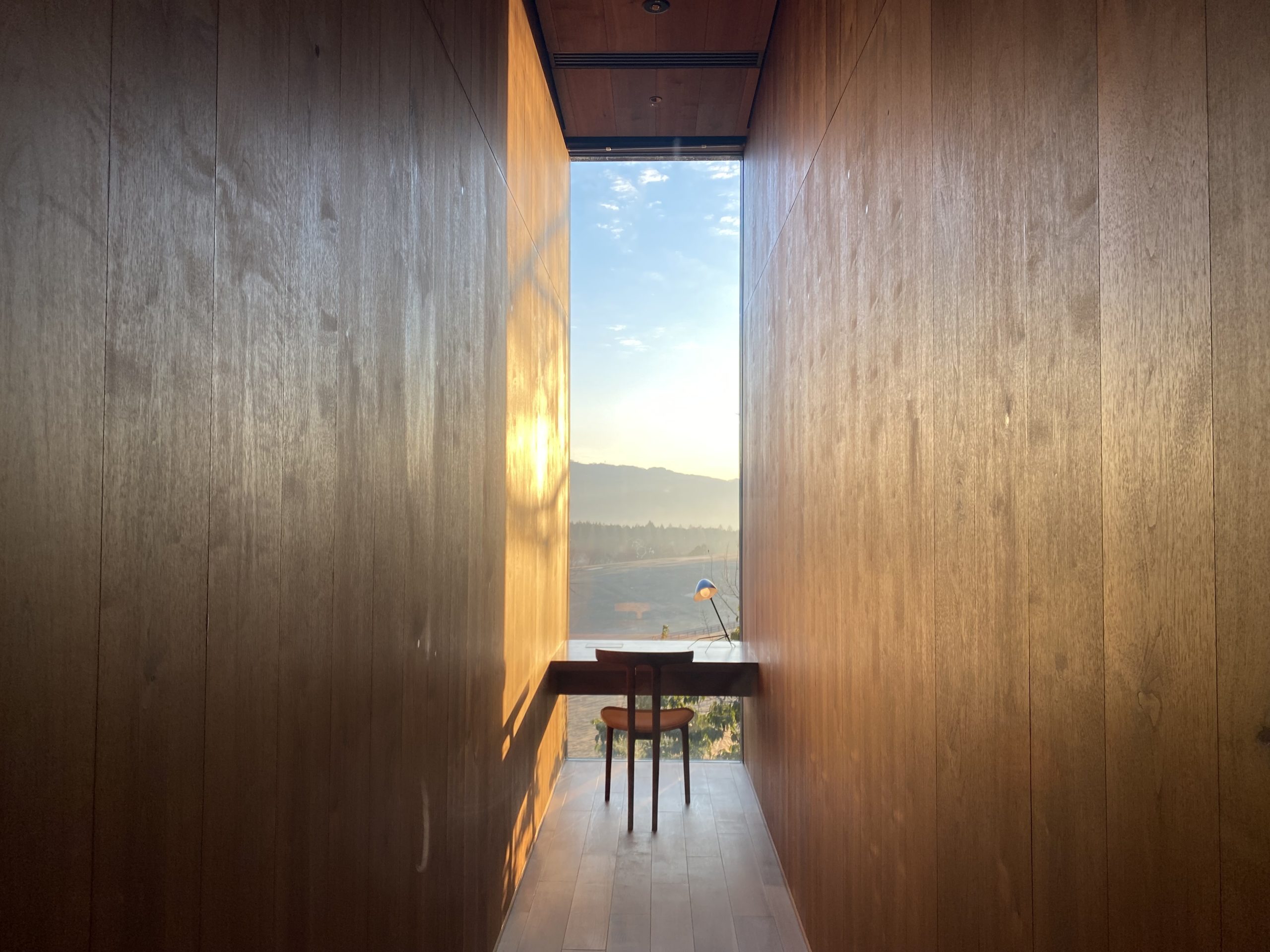こちらは2階のフロア、廊下の突き当たりの牧場を望む絶景の書斎であります。こんな所来て仕事する人いるのだろうか😆